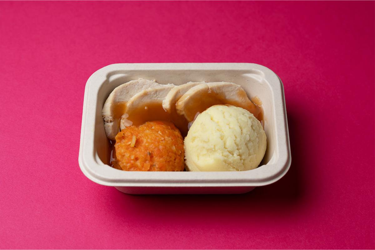 Slices of roast chicken breast served with gluten-free gravy, mashed potato and mashed carrot & parsnip