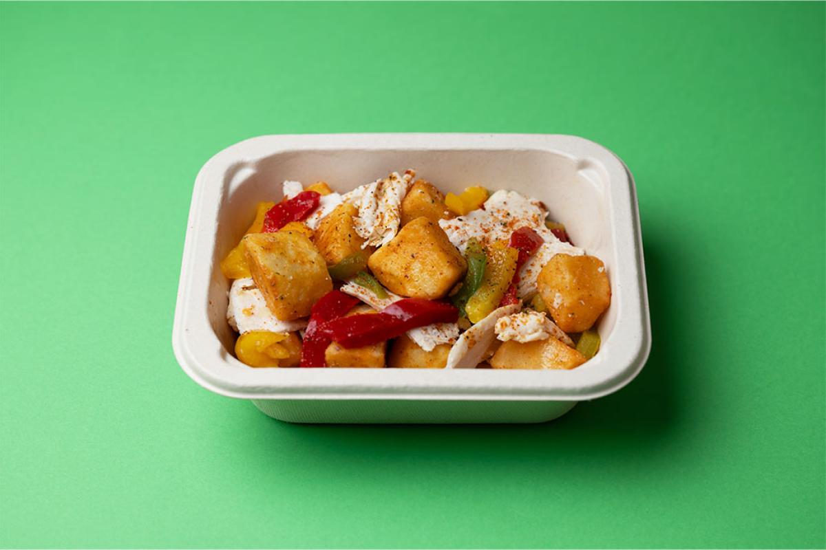 A mixture of roast chicken breast in a mild spice mix, served with peppers and baked potato bites